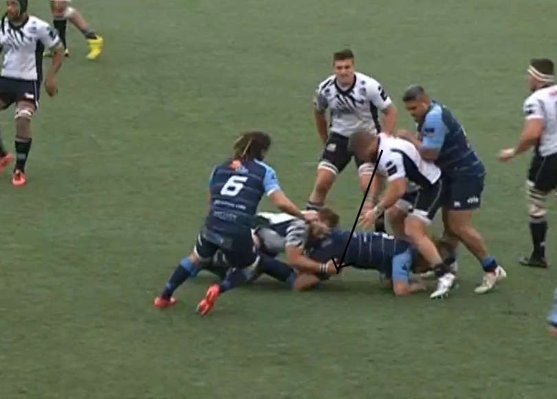 In this instance it’s Kris Dacey that trucks the all up, keeps the low body position but is tackled mostly by the first Zebre player. His team-mate makes a slight attempt to assist in the tackle but is mainly waiting for the hooker to go to ground and then he is able to compete for the ball before Josh Navidi can arrive in support.