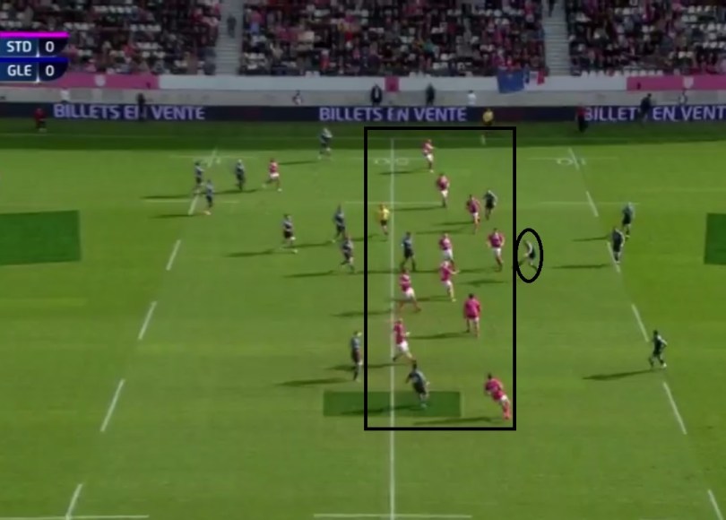 Judging by the example of the rest of the season, any ball in or around our own 22 dealt with via an exit strategy. Against Stade though the idea was to run from deep, unfortunately that left us in situations like the one pictured above, whereby Halaholo just ends up punting the ball through to the home side’s covering defenders who can counter-attack with greater ease than they would be able to from a high kick.