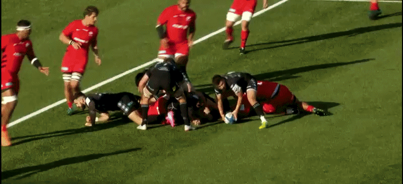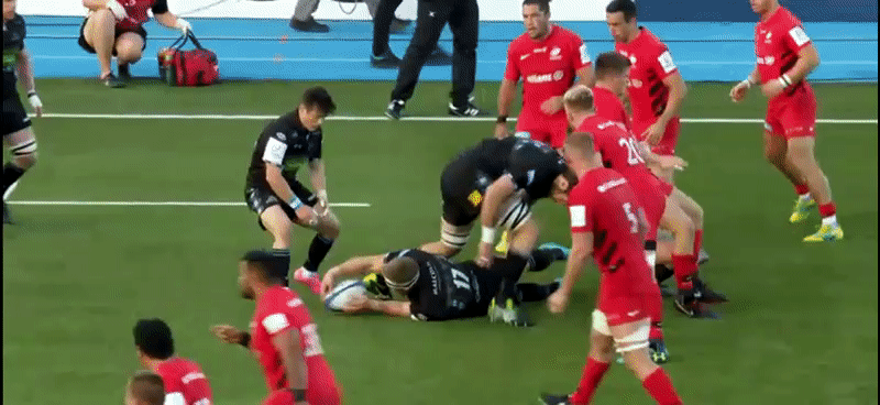Their inside defenders don’t carry through the drift and in the end a huge gap opens up right in the heart of the Saracens defence which the Scottish international just runs straight through.