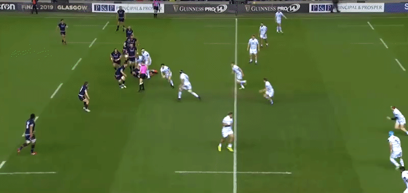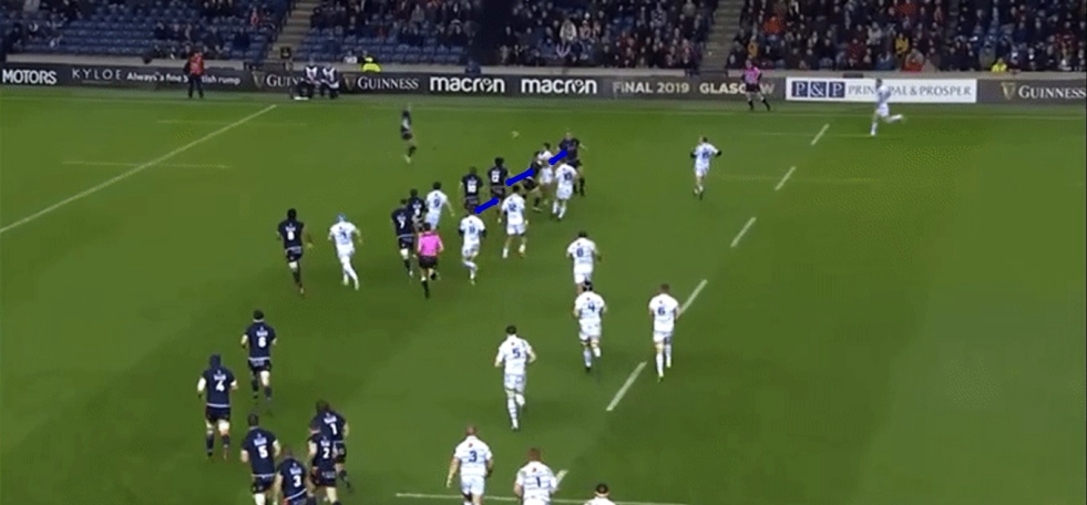 In the end by the time Lee-Lo does straighten his line, the lateral inefficiency of the setup means Edinburgh’s drift is still really tight and they are able to hit the Cardiff Blues player as he receives possession and force the turnover.