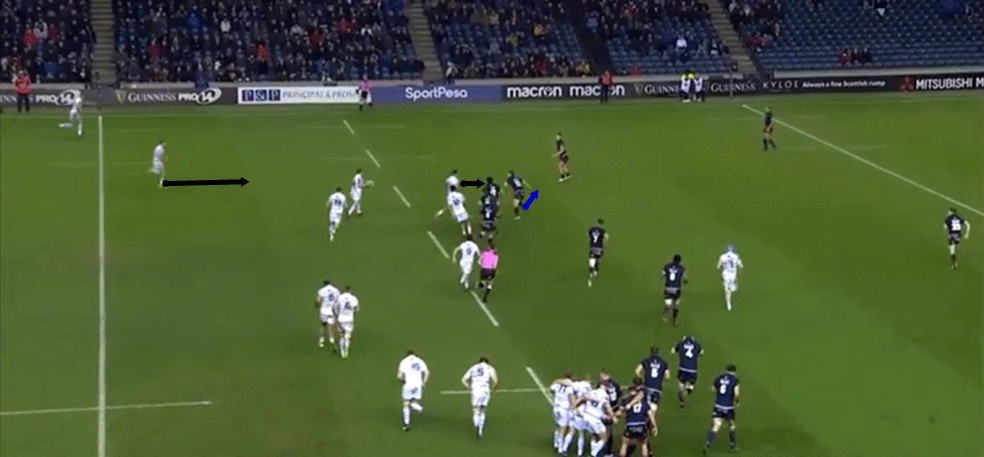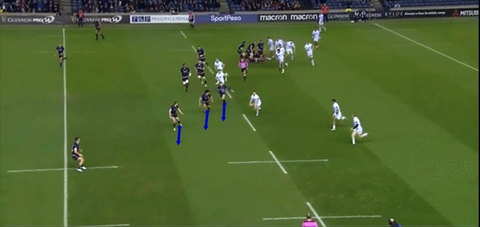 That direct work off the ball is a huge part of creating space in our attacking game, and was key in the second Cardiff Blues try of the game, as Edinburgh are unable to get their drift defence going.