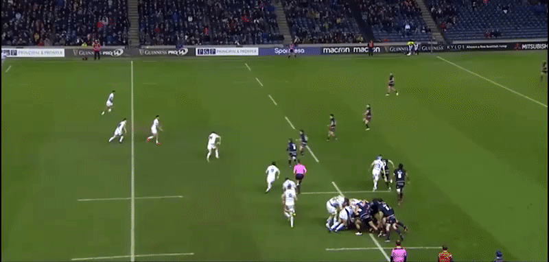 From more first phase ball in even better field position the dummy line from Willis Halaholo is not exactly convincing and ends up following the Edinburgh drift, while Rey Lee-Lo and Dan Fish are too lateral to begin with outside Jarrod Evans.