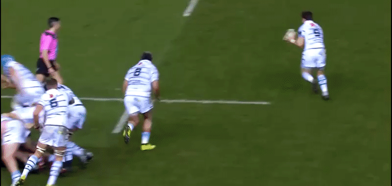 Nick Williams barreling towards the opposition on a decoy line means they have to ‘sit down’ (hold their position), to avoid the number eight taking possession and bowling straight over the defender.
