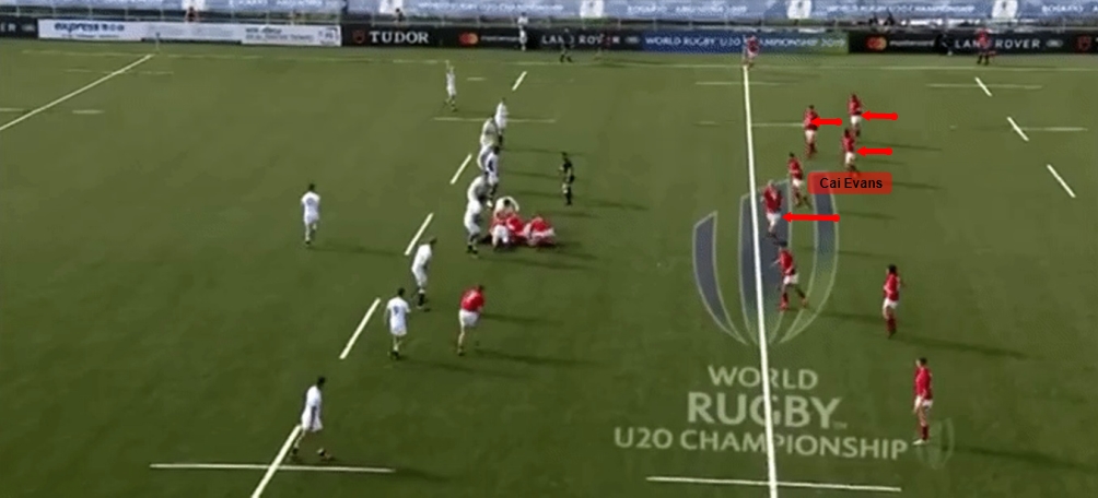 That works for a phase, but instead of staying organised and in control of the game, Wales fan out, with Cai Evans the only back in position and joined both inside and outside him by forwards who should be taking the team through another phase before the backs line-up towards the left-hand touchline.