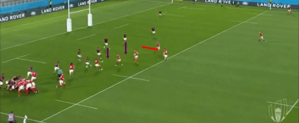 The adjustment for Georgia sees the fly-half’s defensive position start a lot narrower than it would have normally, so that when Wales this time play off 10 he is having to make up ground.