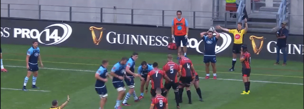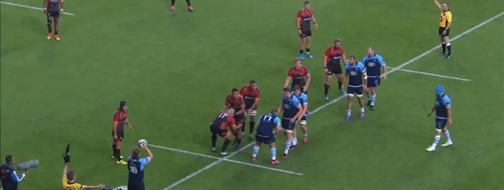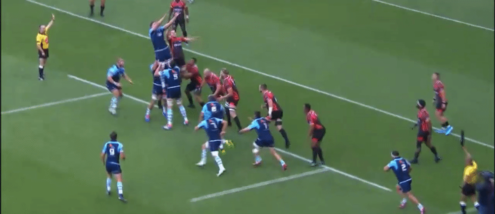The long through to the back engages the jumping pod at the rear of the lineout, with Nick Williams, Olly Robinson and Brad Thyer from the Cardiff Blues front pod moving around in unison and pushing the maul to the openside of the field.