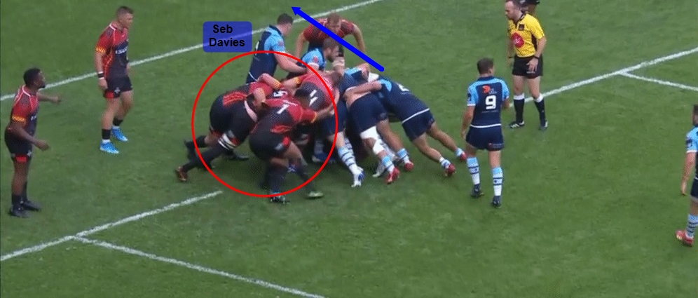 Seb Davies forms a pillar at the front of the maul initially, and when he is removed as Cardiff Blues spin the drive around the corner, he takes at least three Kings defenders with him, opening up space to move into.