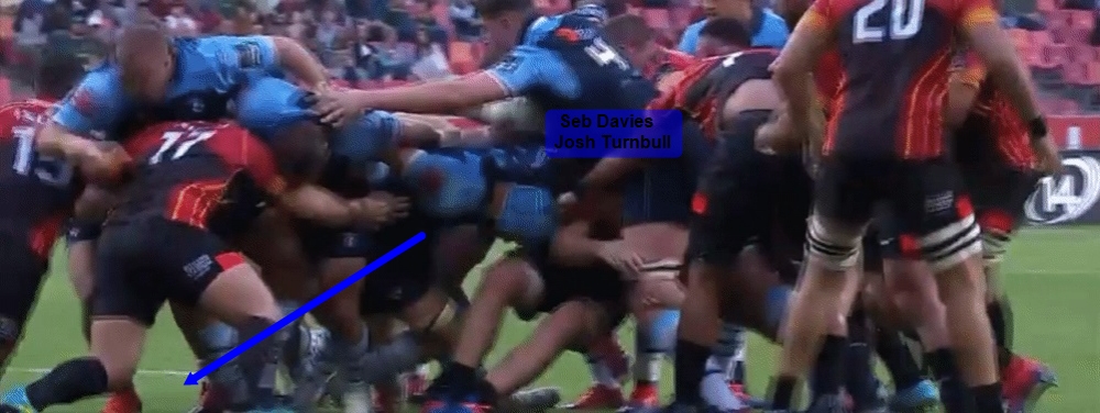 On the face of it the maul appears slightly messy at this point, but Josh Turnbull has taken over as the pillar at the front of the maul and holds three team-mates in shape with him, so that when Willis Halaholo joins the drive and adds some momentum, pushing over the line is a straight forward task.