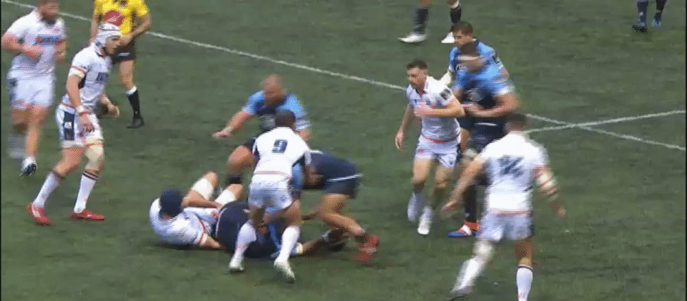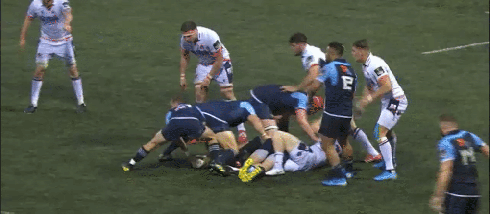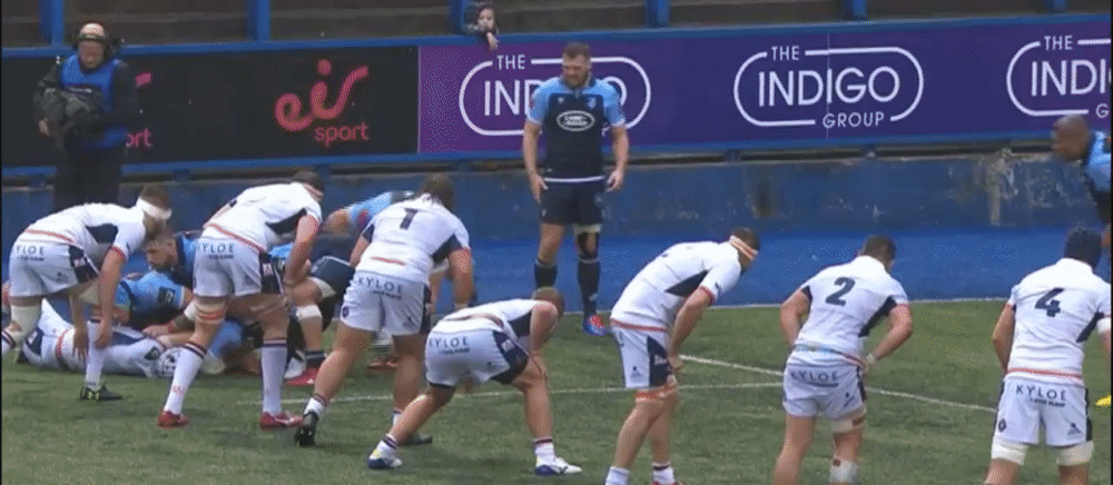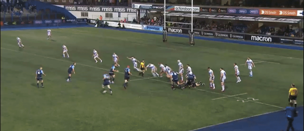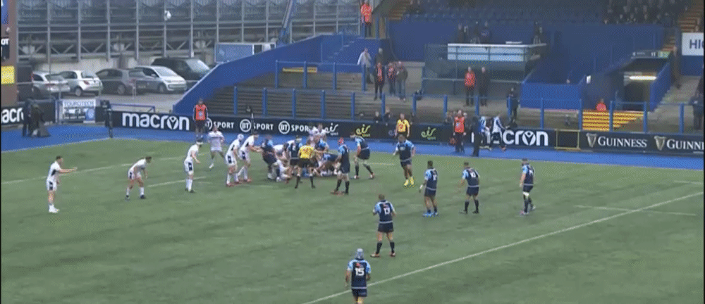 On both of the above occasions the pods are structured too loosely in an attempt to trick the defence into thinking that any one of the three Cardiff Blues players will be carrying, hopefully resulting in one-on-one tackles which allow us to get over the gainline and set up the box kick cleanly.