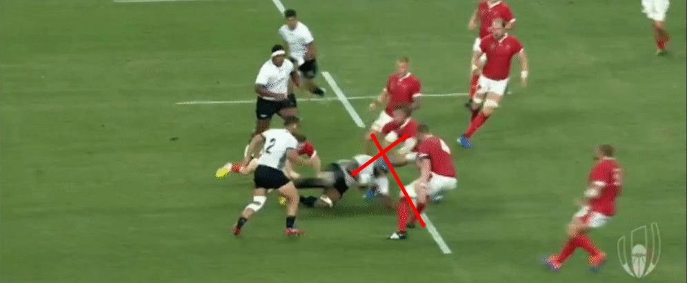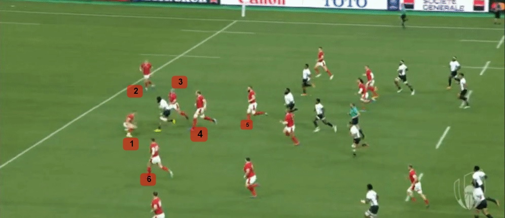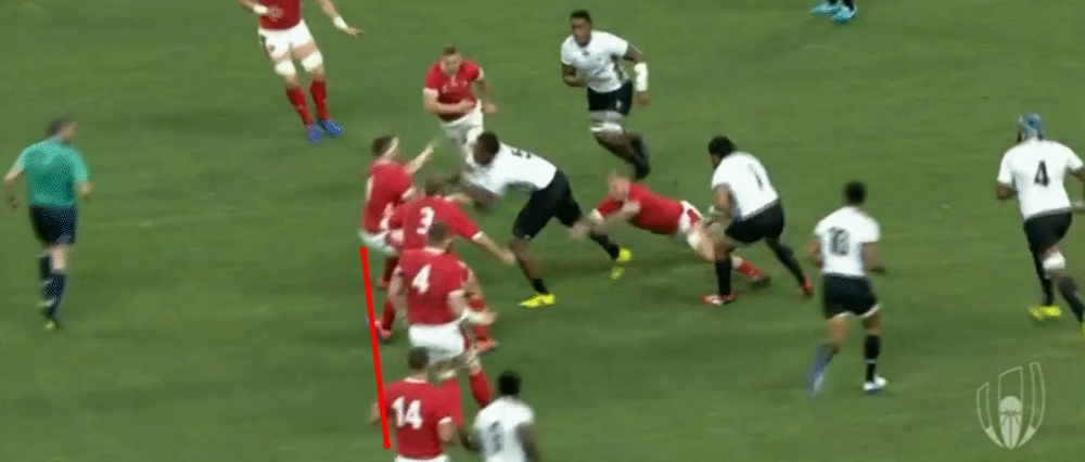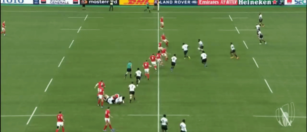 As the Fijian players breaks there are six players closer to him than his nearest teammate in support, a nod to the hard work of the Welsh defence in closing down the breaking player, and also getting into a defensive line ready for the next phase.