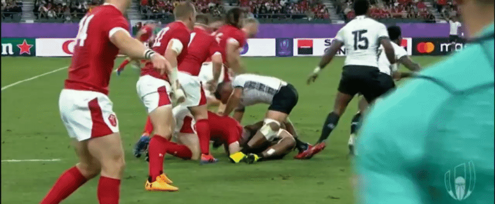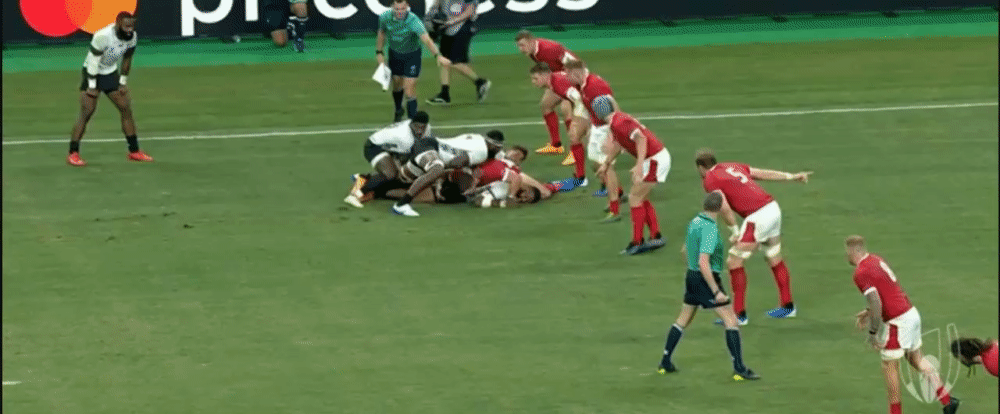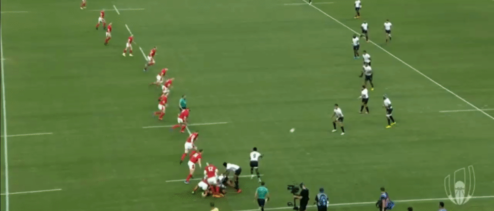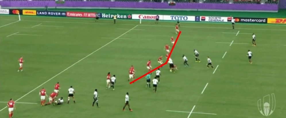 Fiji are then unable to capitalise on their line break, and from the next phase end up throwing the ball into touch as they try and play too quickly with Wales already set in defence.