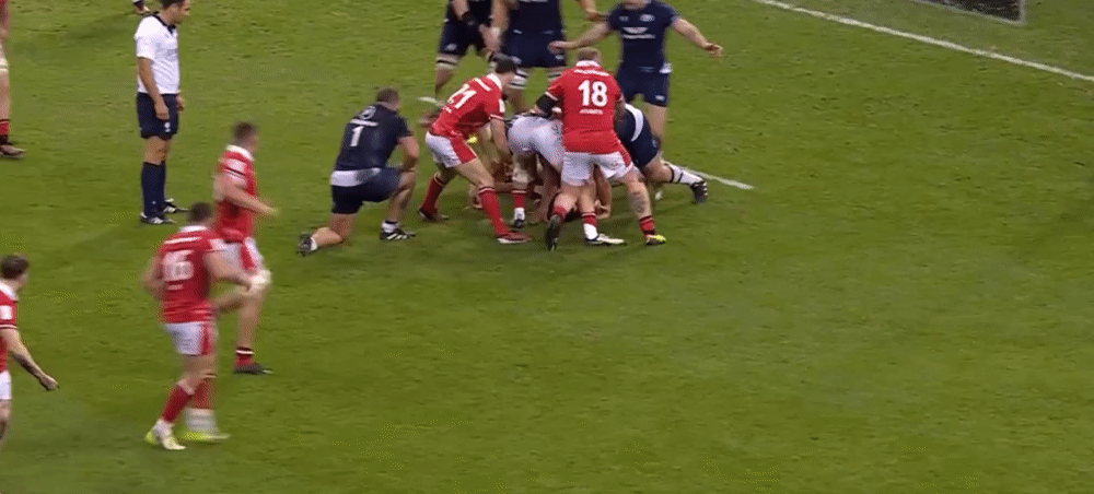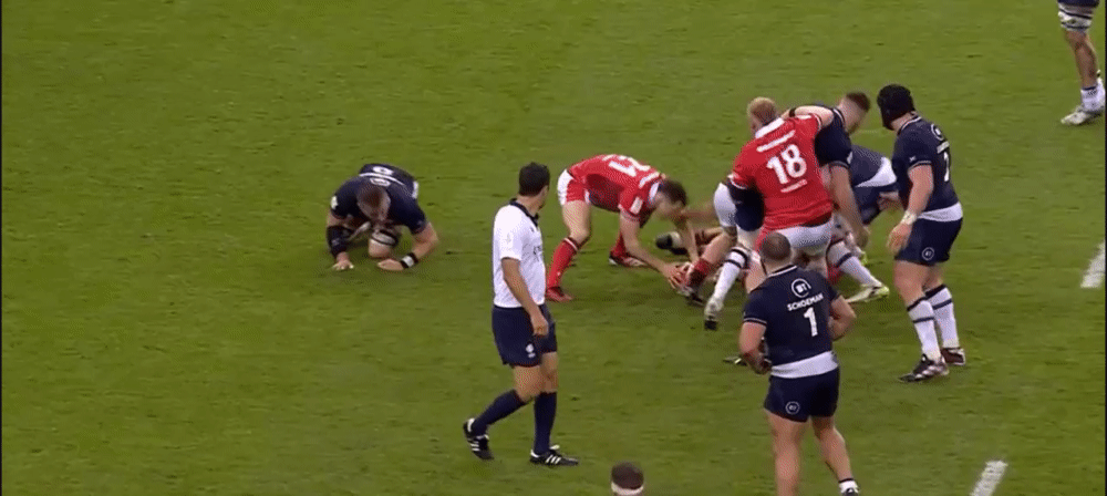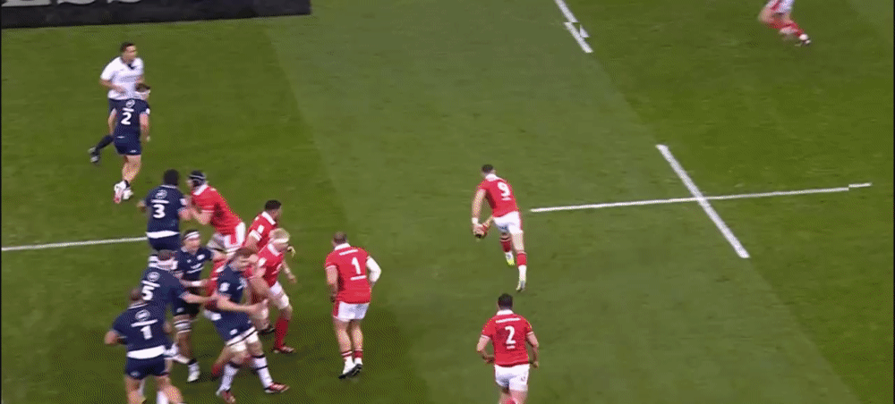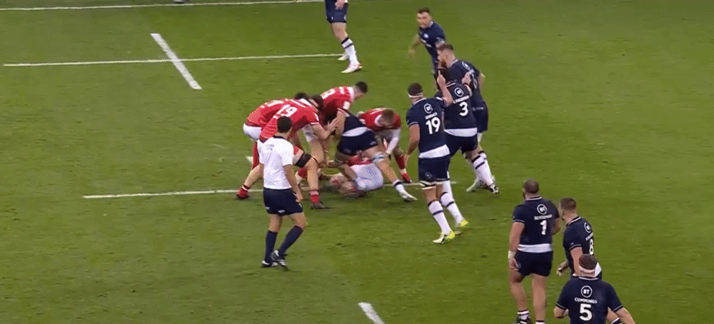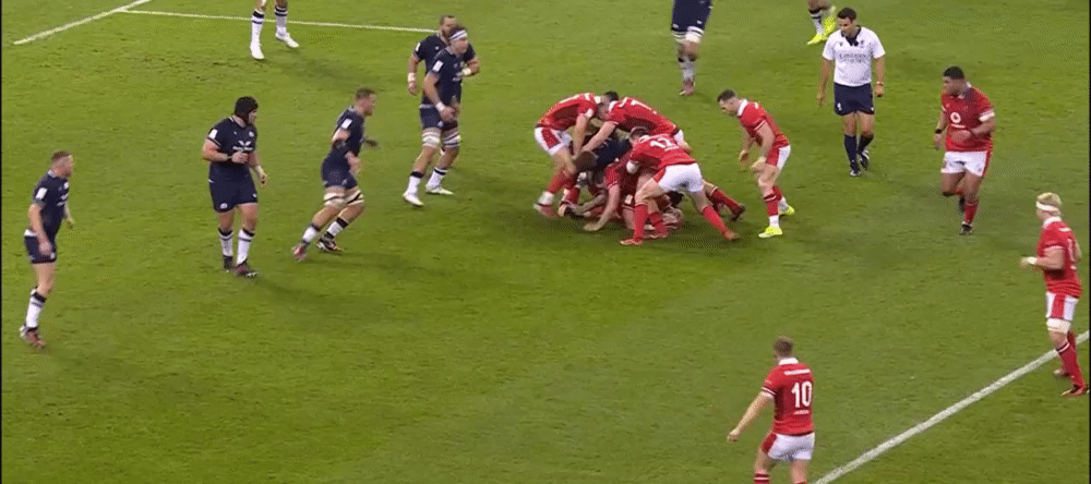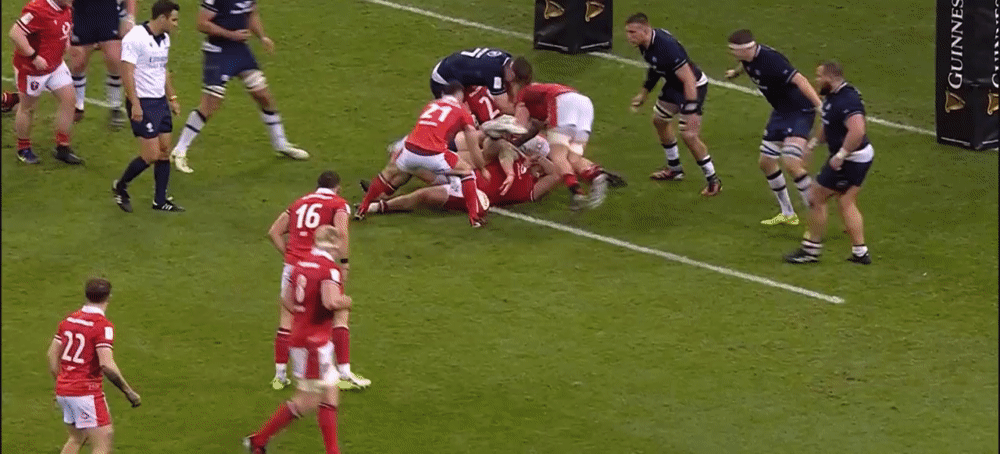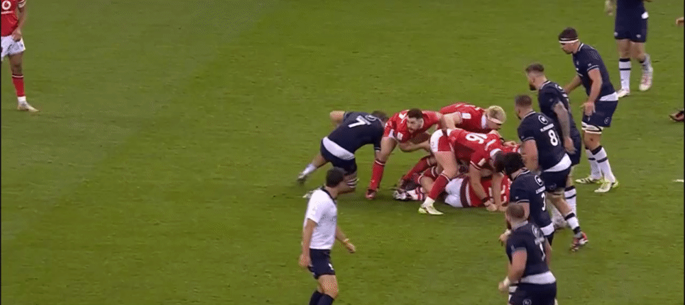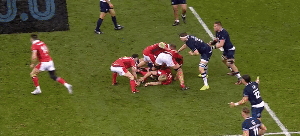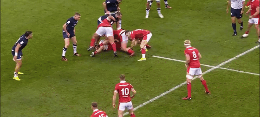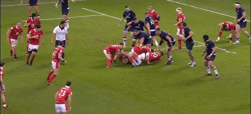 Following on from Adams being pushed back on first phase, Scotland are ready to punch Botham back from the gain line, and then the shape of Wales’ attack begins to falter. I’m no critic of Adam Beard in the way some are, but a competent attacking game plan does not have him regularly carrying the ball ahead of Corey Domachowski, Ryan Elias, Dafydd Jenkins and Aaron Wainwright.