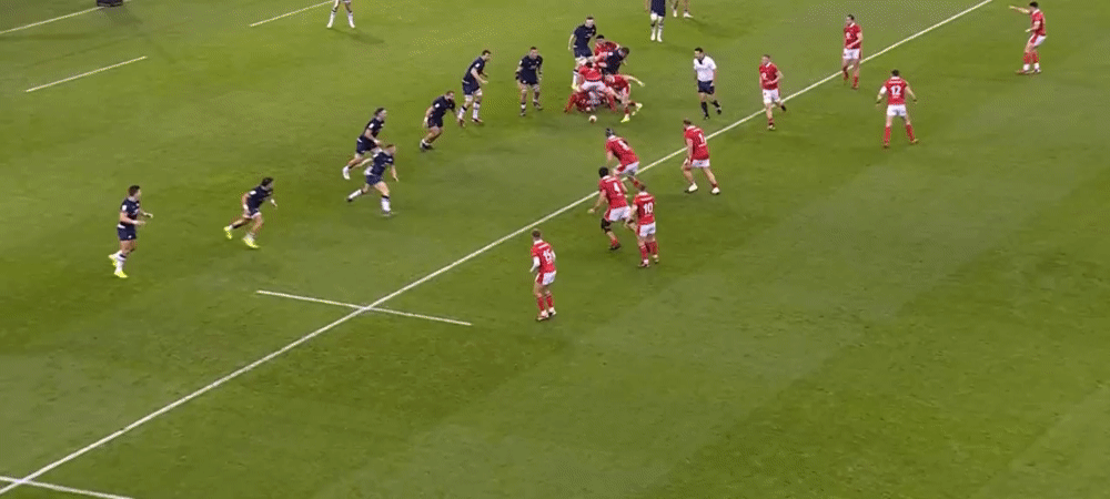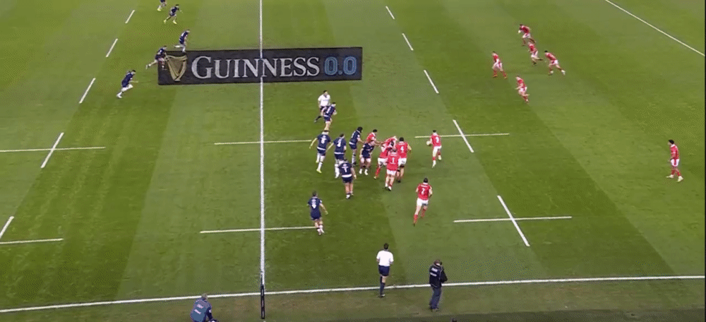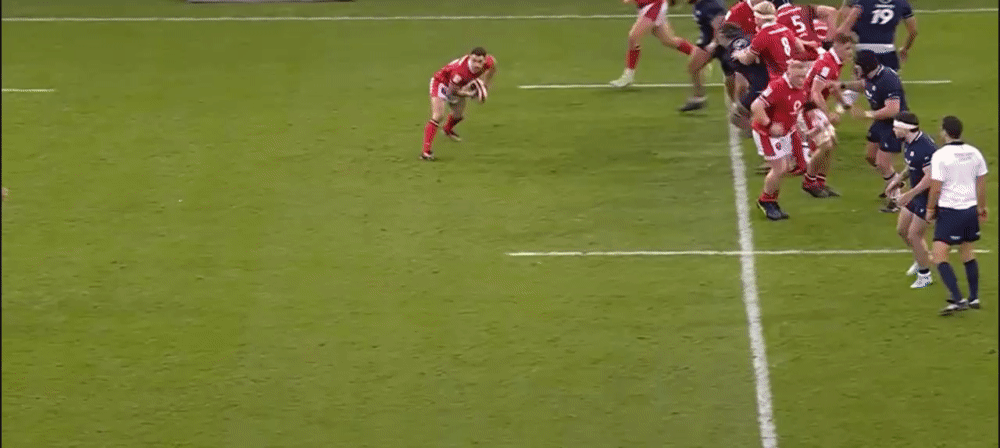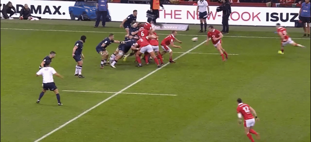 Now it’s different as Tomos Williams moves the ball long across the face of the defence to Dyer, with a bit more depth and a front foot opportunity to carry and entice Scotland to go off their feet, conceding a penalty.