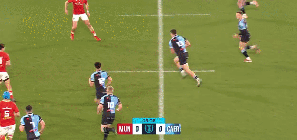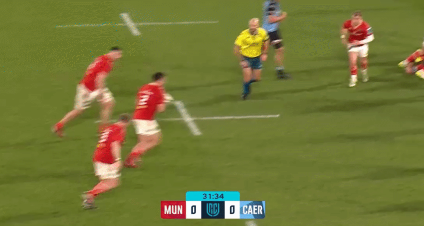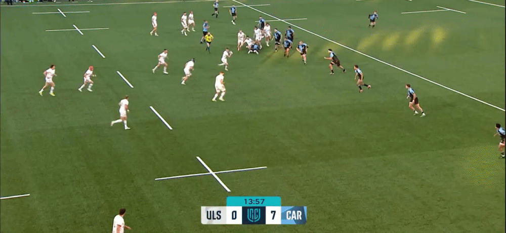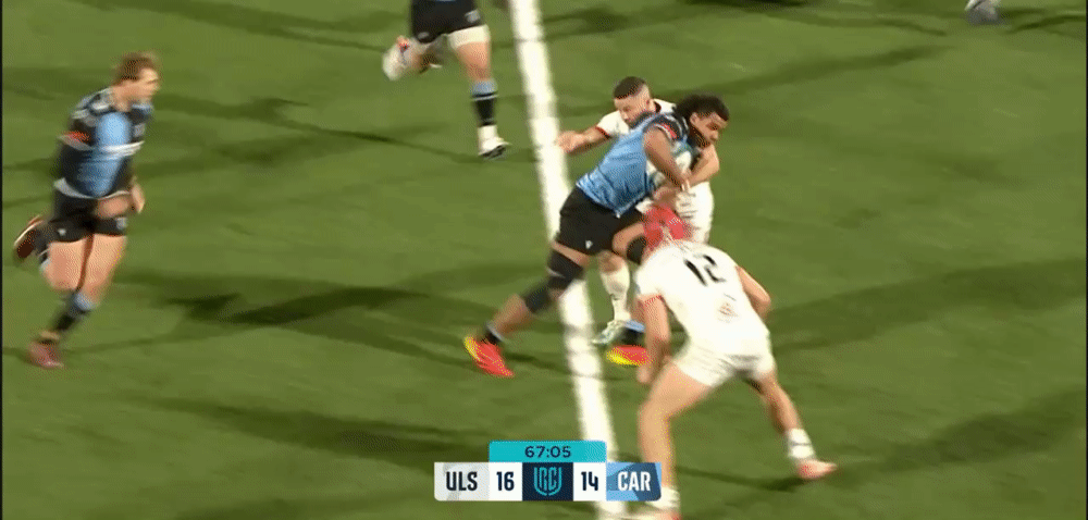 There will always be occasions when the outside centre is overrun with opposition strike runners, but Grady is patient enough to stay in the defensive line, keep his shoulders open until the last second and react to the decision made by the Ulster playmaker to make a tackle that ultimately forces a turnover in this circumstance.